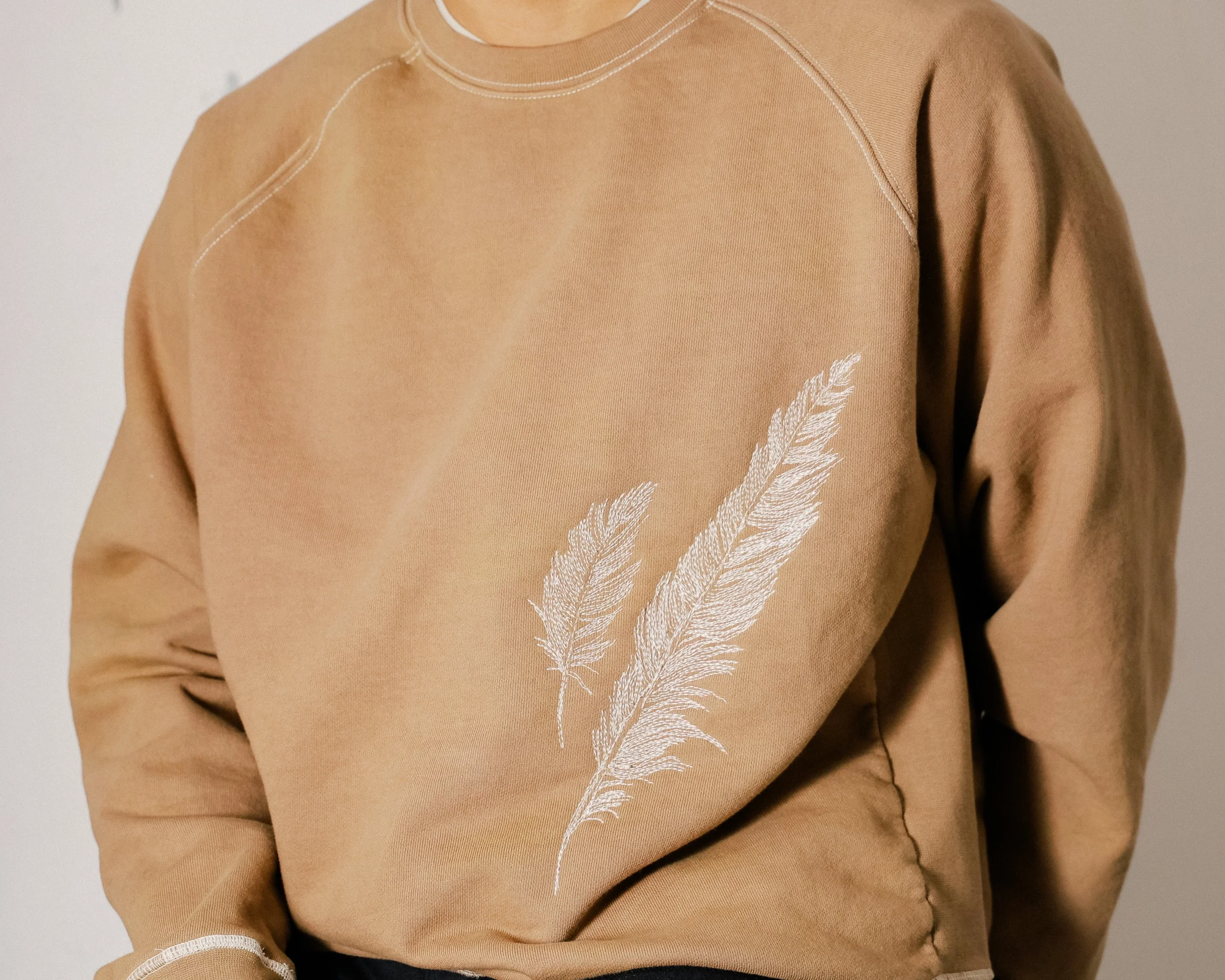 hand dyed garment to achieve a custom color, with feather shapes drawn onto the fabric and sewn in to create the illustration