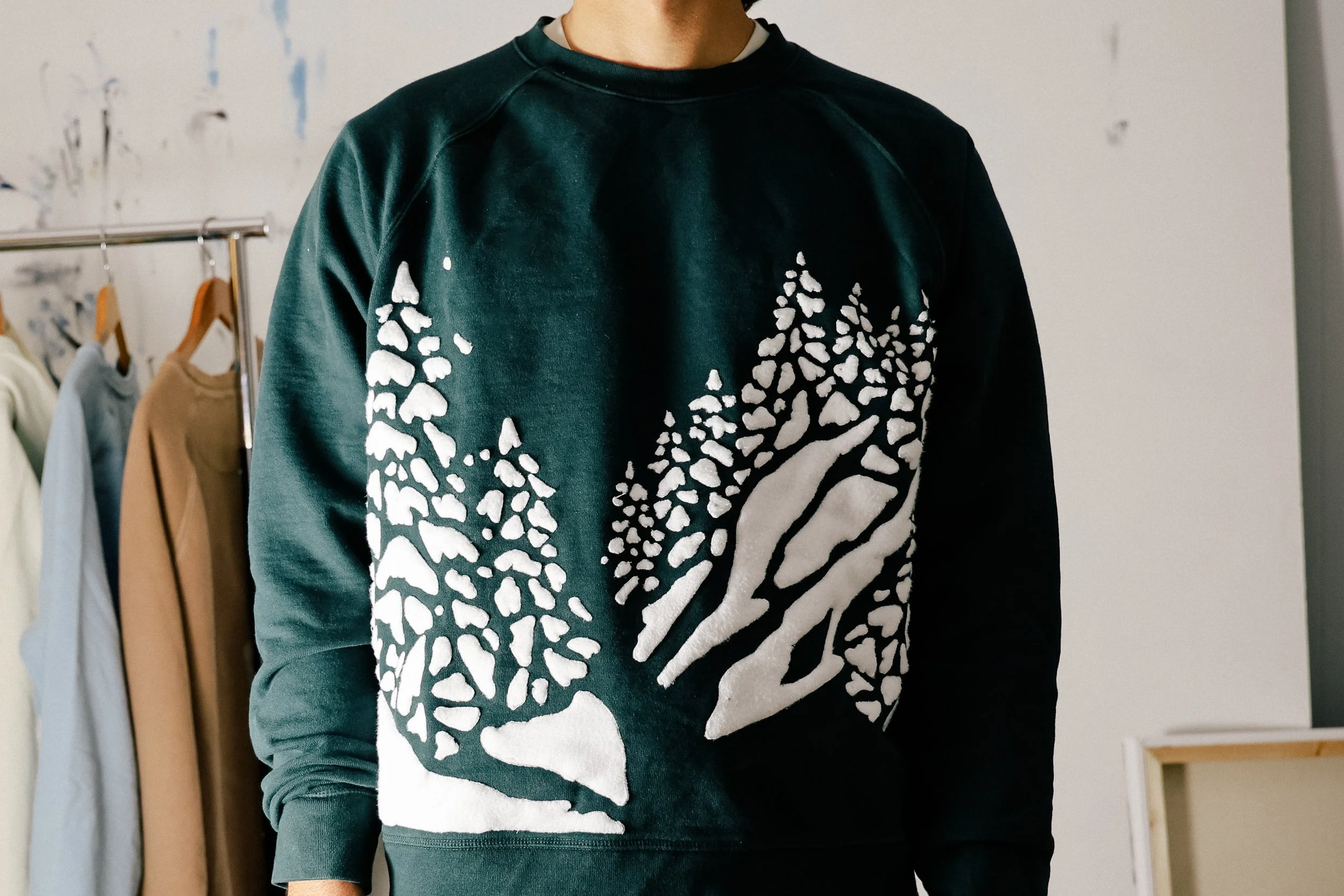Made to both reflect and complement a summer spent on Lake Michigan, this collection features cotton sweatshirts, airy linens, and knit sweaters, all with our hand-painted, drawn, and sewn artwork.
